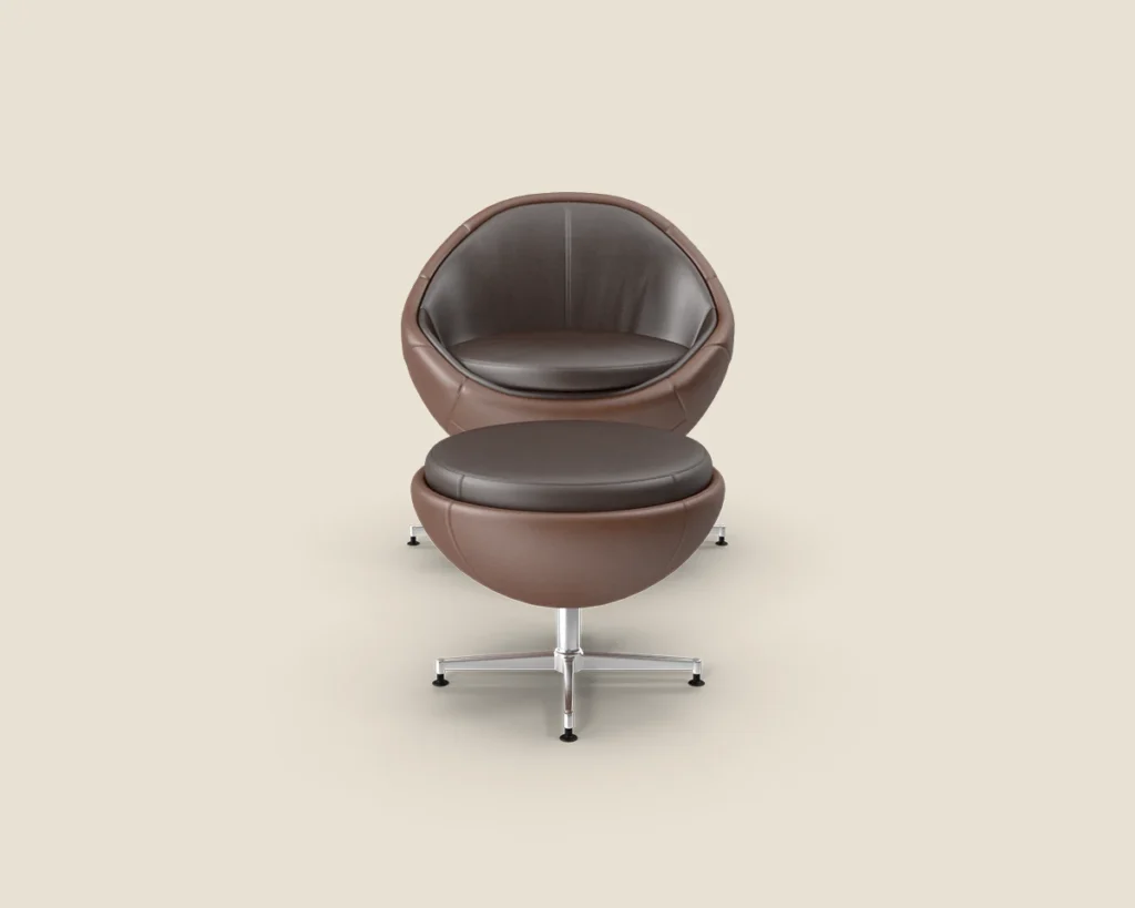 The Orbit Recliner combines futuristic design and comfort with premium leather upholstery, a sleek metal base, and a matching ottoman, perfect for modern living spaces.