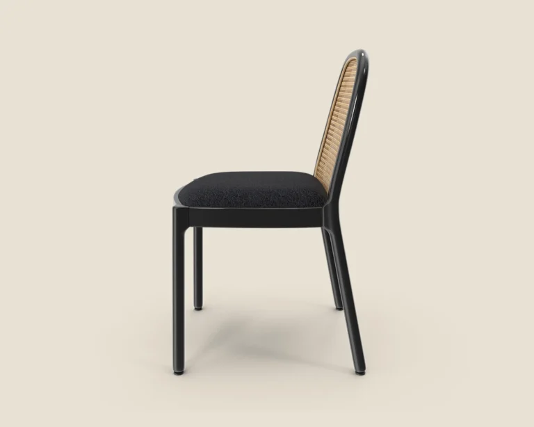 A modern chair with a woven cane backrest and padded seat, blending style and comfort for contemporary interiors.