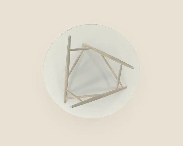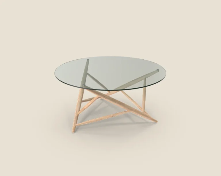The Axis Table combines a sleek glass top with a unique geometric wooden base, bringing modern style and structural elegance to any space.