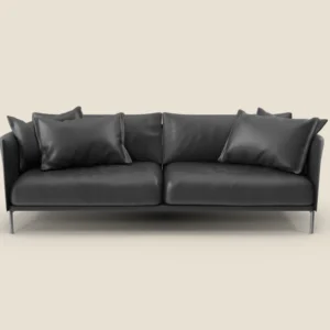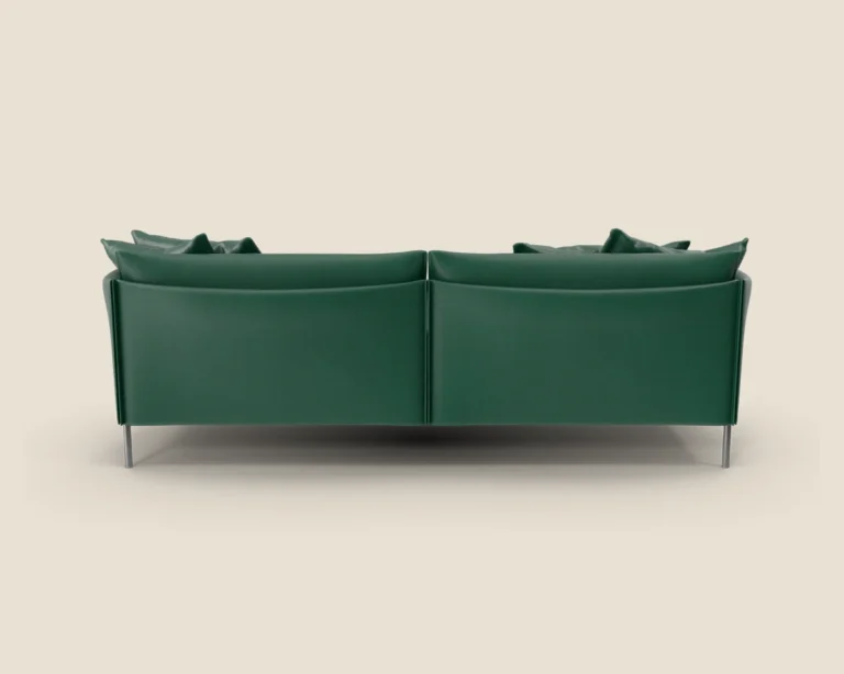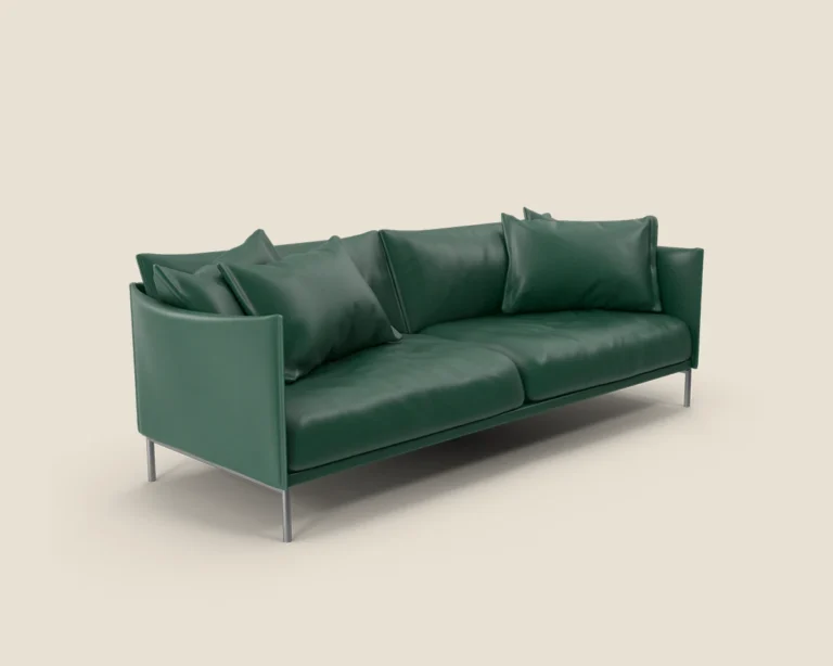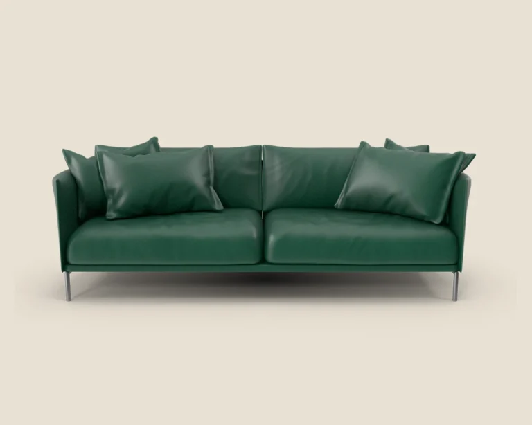 The Emerald Comfort sofa offers a striking deep green leather finish, plush cushions, and modern metal legs, making it a luxurious and stylish addition to any living room.