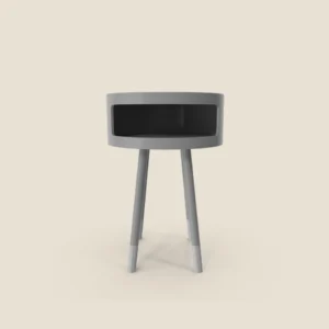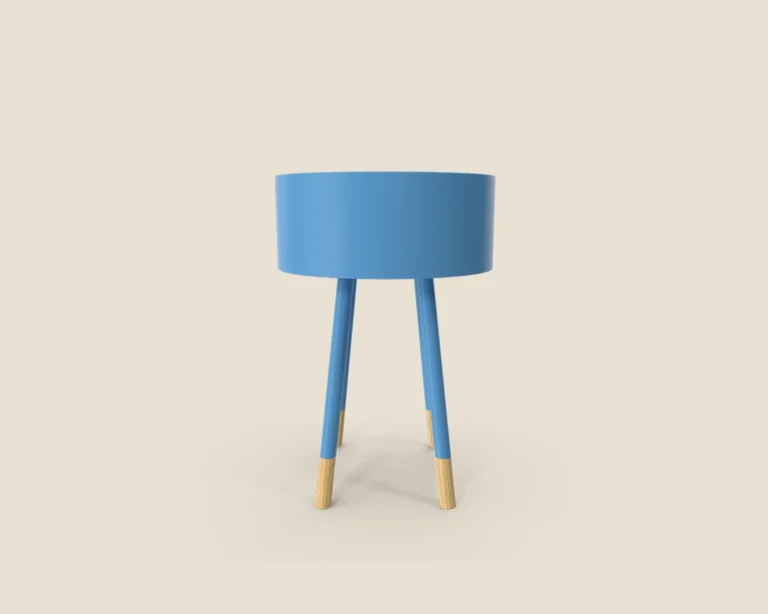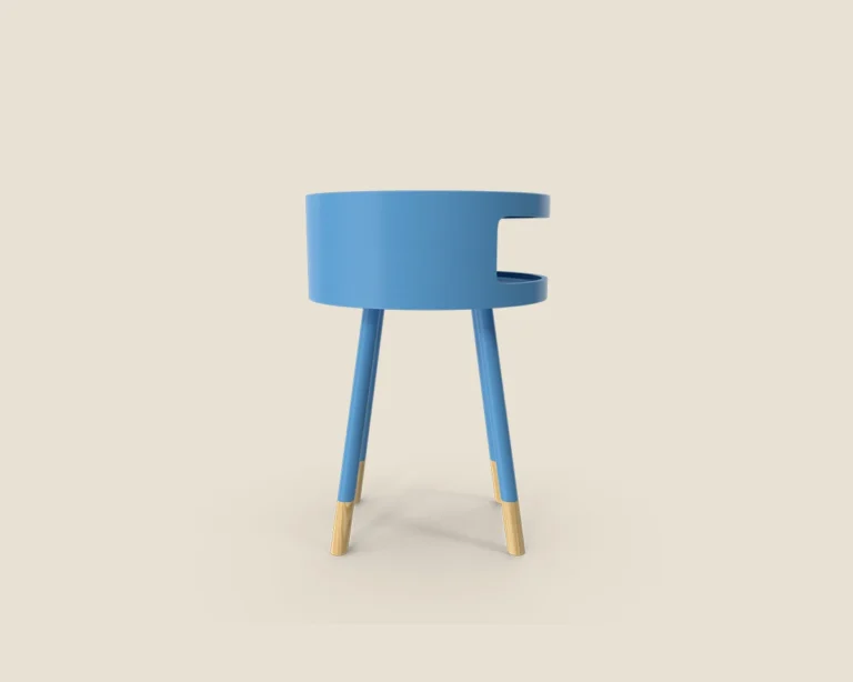 The Sky Table combines vibrant blue color with natural wood accents, offering a compact and stylish design with an open storage compartment for modern spaces.