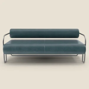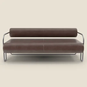 A contemporary sofa featuring a sleek metal frame and plush cushions, offering both style and comfort for modern spaces.