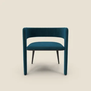 The Velvet Curve chair features a luxurious velvet finish, ribbed detailing, and a sleek modern design, making it perfect for adding a stylish touch to any room.